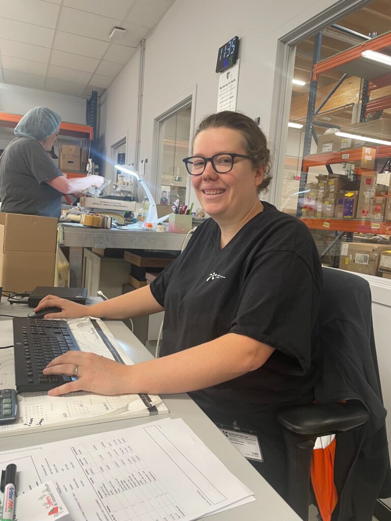 “Onze werkdag begint eigenlijk al een half uurtje vóór de bel gaat,” vertelt Sofie. “Dat moment gebruiken we om met collega’s te overleggen: een korte briefing, wie staat waar vandaag en wat staat er op de planning.” Om half negen gaat iedereen naar zijn afdeling. Sofie begroet haar team, verdeelt de taken en staat haar maatwerkers de hele dag bij. Of het nu gaat om praktische vragen, kleine problemen of werkgerelateerde issues: Sofie is er. Haar afdeling focust op verpakking, met een sterke specialisatie in medische kits. Van bloedafnamesets en buisjes tot grotere kits voor laboratoria, alles wordt met zorg samengesteld. Tijdens dat proces voert Sofie regelmatig kwaliteitschecks uit. “Niet om mensen te controleren,” benadrukt ze, “maar om foutjes eruit te halen. Zo kunnen we samen kwalitatief sterk werk afleveren.”